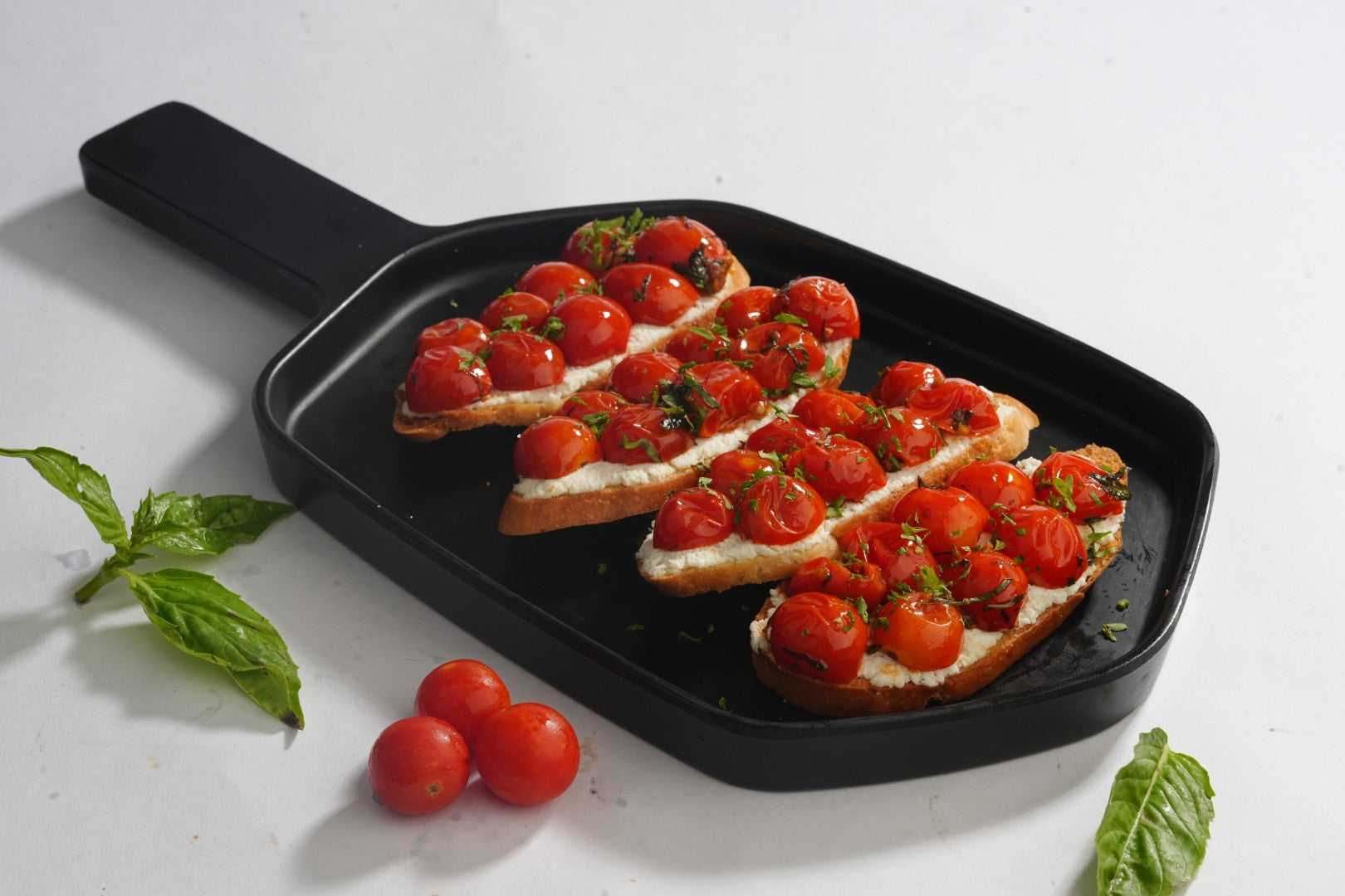 Crisp, golden crostini infused with aromatic herbs, topped generously with smooth ricotta cheese and fresh, succulent cherry tomatoes.