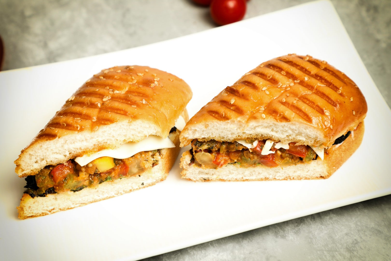 Indulge in a satisfying sandwich packed with vibrant ratatouille vegetables, creamy soft cheese, and a blend of fragrant herbs that elevate every bite.